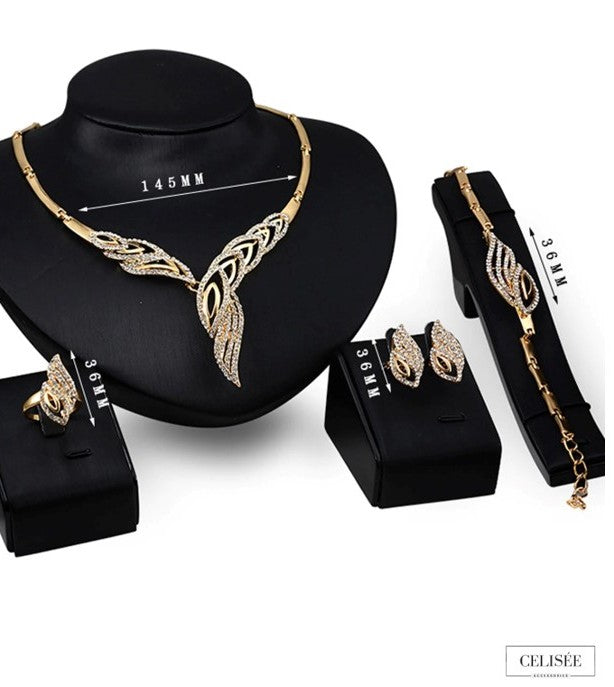 Das Set besteht aus Halskette, Ohrringen, Armband und Ring – perfekt aufeinander abgestimmt für einen harmonischen Glamour-Look.