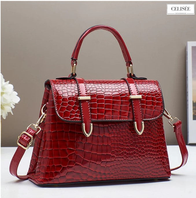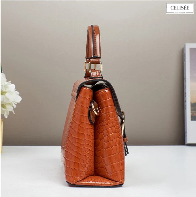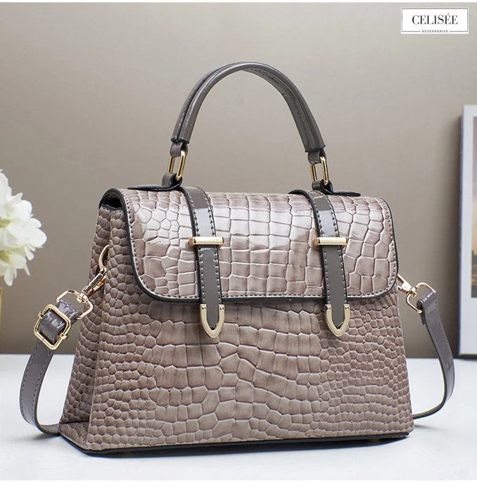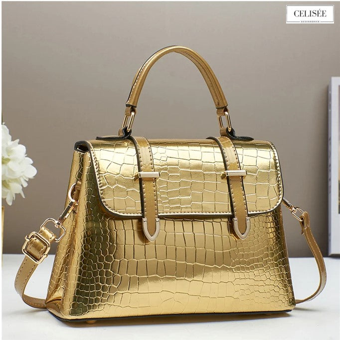 Maße der Tasche: 25 × 10 × 19 cm – gefertigt aus strukturiertem PU-Leder mit zart glänzender Oberfläche und goldfarbenen Details; ausgestattet mit komfortablen Henkeln und edlem Zierelement.