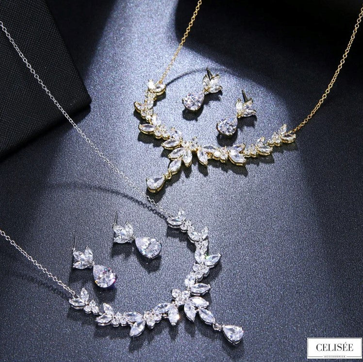 Feinste Kubikzirkonia-Steine, kunstvoll in Blattform gefasst, verleihen diesem Set einen außergewöhnlichen Glanz, der an edle Diamanten erinnert.